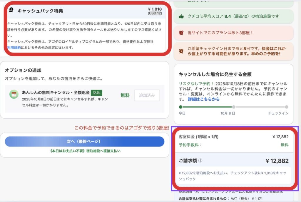 アゴダのキャッシュバック特典は、対象の宿泊プランを予約・宿泊完了後、後日宿泊料金の一部が現金で返金される制度です。