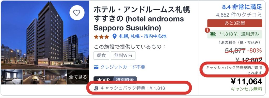 実際のアゴダのホテル検索では、下記の赤枠内のように「キャッシュバック特典」と表示があります。