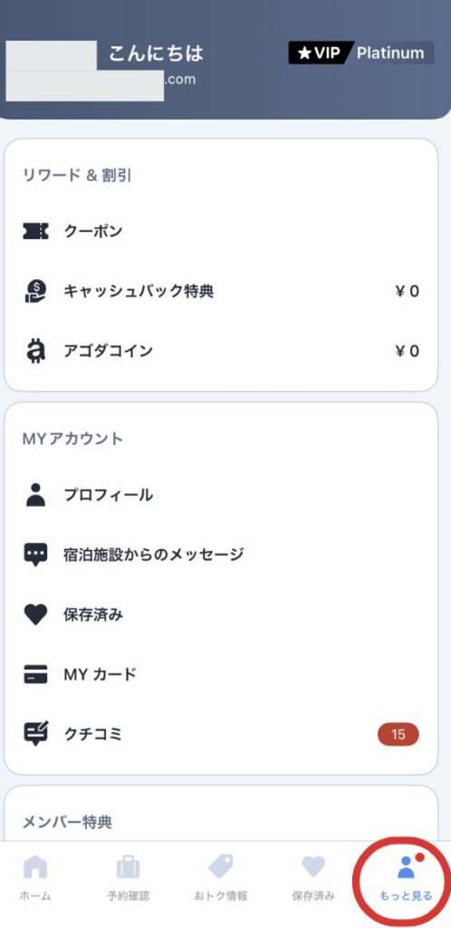 まず、アゴダのアプリから、マイページ(右下の人のマーク)を開いて、「キャッシュバック特典」メニューをタップ。