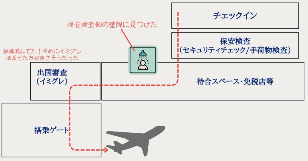 上に載せている、シャワー室ドアの写真に写っていますが、シャワー室は他にも、「Gate3N」にもあるみたい。このシャワー室から、搭乗ゲートに向かうまでにイミグレ(出国審査)があったから、出国審査後にもシャワーがあるということだと思います!