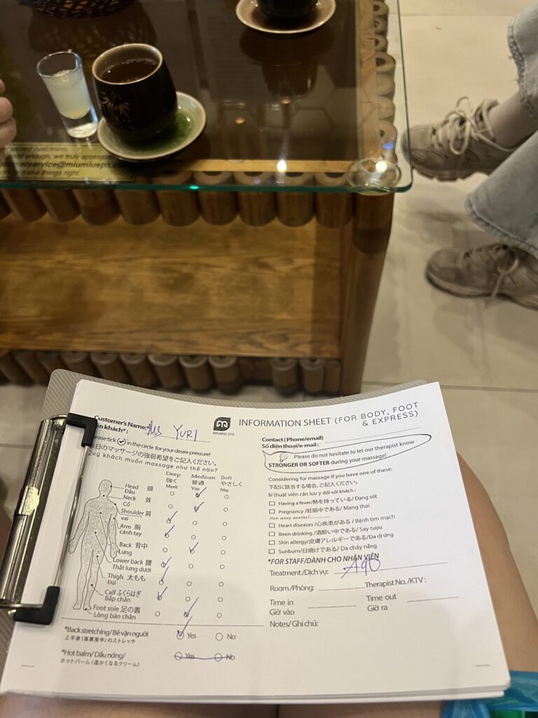 MIUMIUスパは、人気のため、飛び込み利用だと満席で入れない場合が多いため、予約は必須です。予約は、HPからWhatsApp(連絡アプリ)経由でできました。その際に、シャワー利用したいこと念のため伝えておきました。