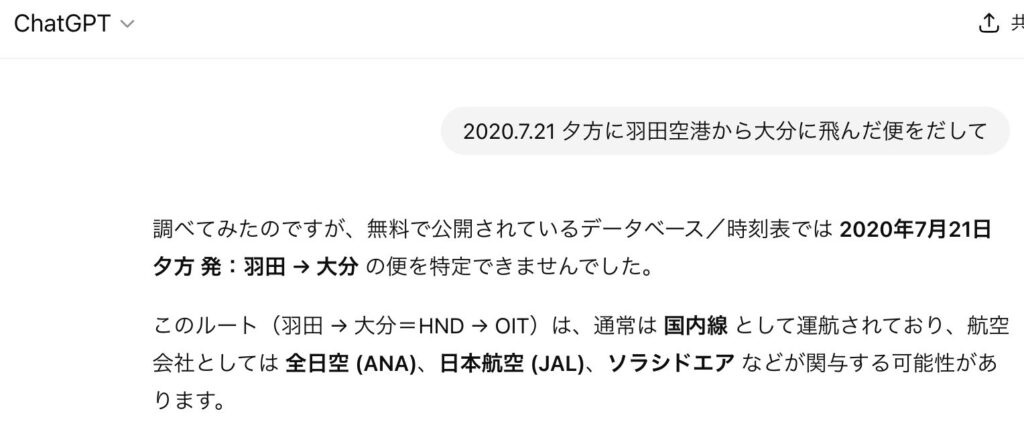 Chat GPTに、『⚪︎月⚪︎日、夕方に羽田から大分に飛んだ便を探して』『ANAだった気がする』『帰りの便は大分夕方18時ごろに搭乗手続き済んでいる』とか、わかる情報を入れていくと、ChatGPTの方で確率が高い便を導き出してくれます。