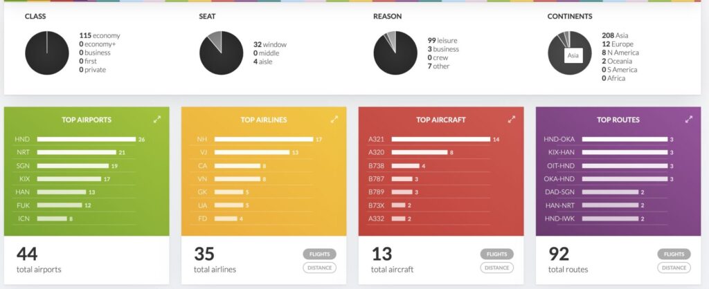 自分で覚えている範囲で手入力した情報にすぎませんが、窓際席に何回座っているか、よく使う航空会社・空港のの傾向もデータ化されます。