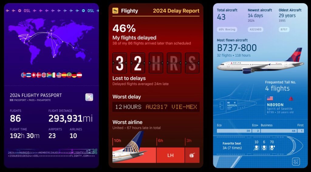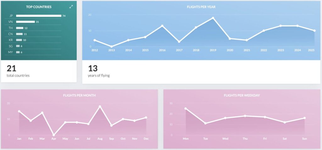 Flightyに入れたフライト記録は、下記のように綺麗に画像にまとまってデータ化されるので、自分の搭乗便の傾向だったり、渡航回数、飛行機遅延で失った時間がどれくらいあるか、遅延によくあった航空会社はどこか?等、自分で記録するのはなかなか難しいところまでデータ化してくれます!