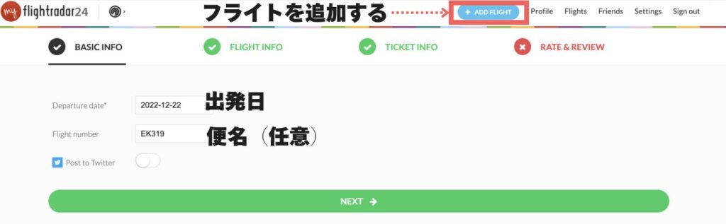 アカウント登録をすると、右上のメニューに「ADD FLIGHT(フライトを追加する)」が出るので、クリック
