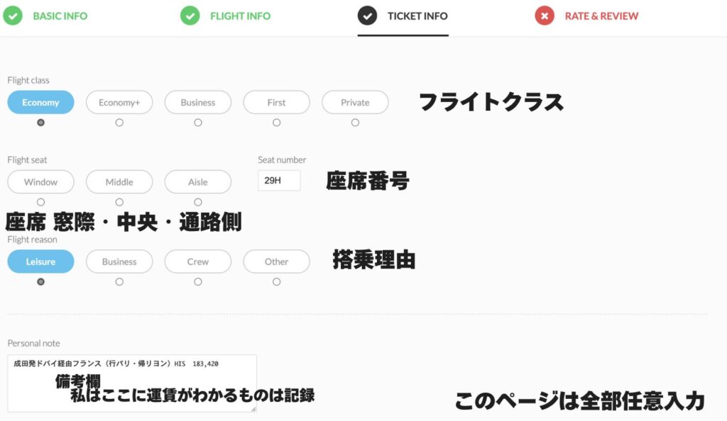 次のページでは、フライトの経路・時間・航空会社・機体名を入れる箇所があります。フライトの経路以外は任意入力ですが、できるだけ具体的に入力した方がデータになったときに面白いので、可能な限り調べて入れましょう!