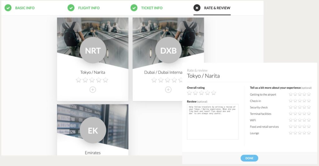 最後のページは、空港と航空会社のレビューができます。これも全て任意。私は全部スキップしましたが、今後登場する分は都度レビューしていってもいいかも。