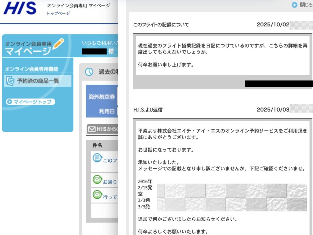 しかし、時間が経ち過ぎてフライトの詳細が消えてしまっていたのです。なんとか詳細を調べてもらえないかと、HISマイページのチャット機能で問い合わせをしたところ、翌日には返信をもらうことができました!
