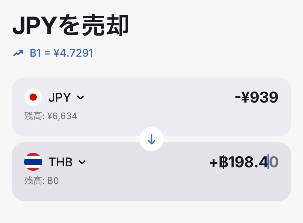 Revolutのアプリでタイバーツ→日本円の両替金額を確認すると939円。