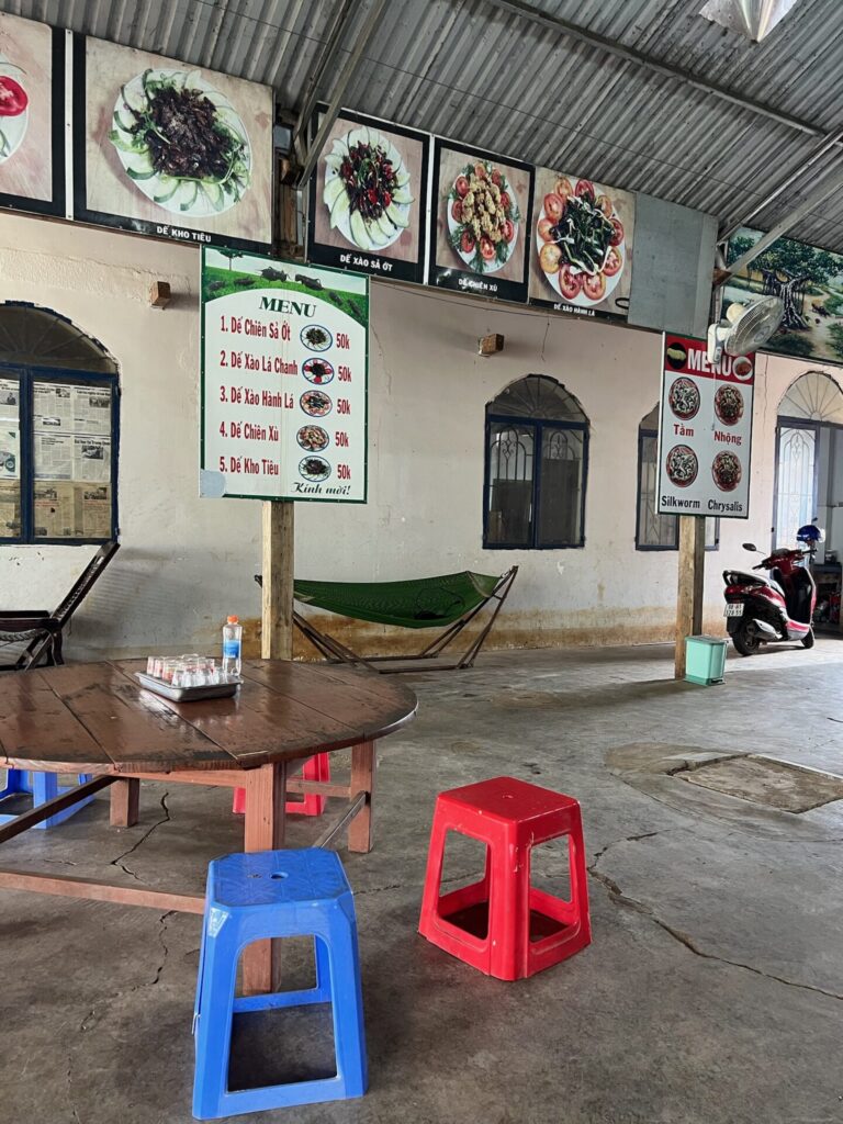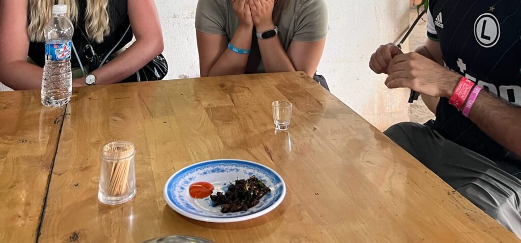 コオロギの養殖場の見学を終えたら、隣接のレストランでコオロギの試食。ここで自家製の酒(ハッピーウォーター)も振る舞われます。でも再利用したペットボトルに入ってて、見た目が〜〜〜って感じだったし匂いのきつい酒で、飲むのはやめておいた。