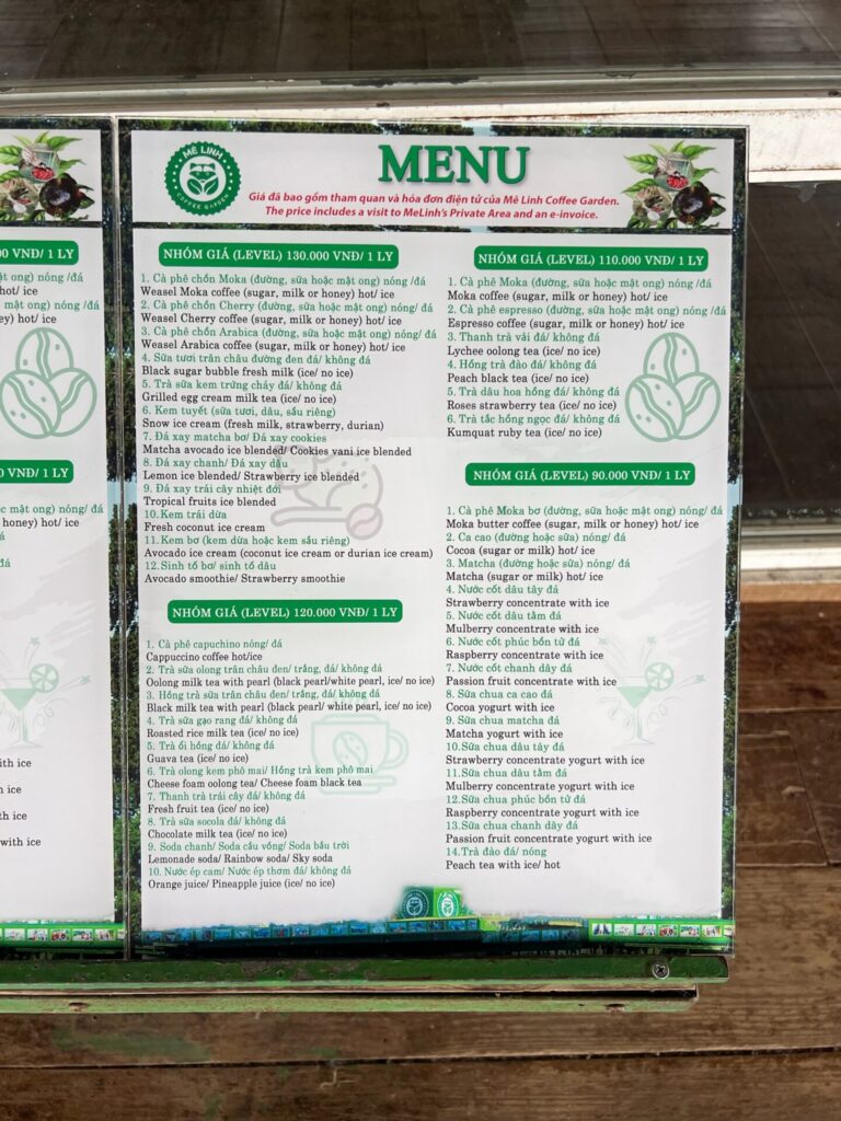 コーヒーメニューは、1杯90,000ドン〜(約500円〜)。少し高めだけど、コーヒー農園直営だし美味しいに決まってる。記念に選んだWeasel Moka Coffee(ジャコウネココーヒー モカ)は130,000ドン(738円)!!