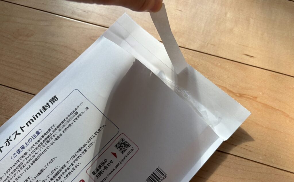 「ゆうパケットポストmini」の専用封筒の閉じ口には、テープがついているので剥がすだけで梱包が完了しちゃう手軽さ。