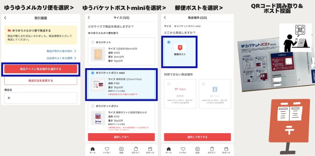 使用方法:メルカリアプリでQRコードスキャンして、ポスト投函。住所は記入不要で匿名配送ができます。