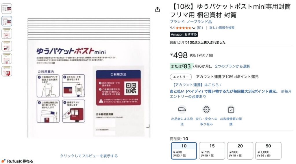 「ゆうパケットポストmini」の専用封筒は、郵便局、100円ショップ(セリア・ダイソー)、コンビニ(セブンイレブン・ファミリーマート・ローソン)で購入が可能ですが、どうしても買いに行くのが手間に感じる時は、Amazonでも購入が可能です!