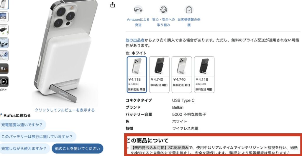 確認すると、Amazonの商品名には『3C対応』の文字、商品説明には『【機内持ち込み可能】3C認証済み』と記載がしっかりありました。