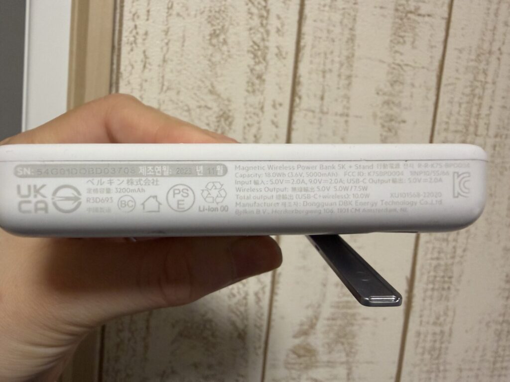 - BelkinのポータブルMagnetic Wireless Battery 5,000mAh スタンド付きは、「3C認証済み」だけど、本体にマーク印字がない