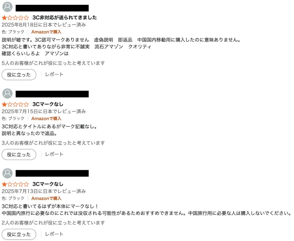 Amazonのレビューには、2025年6月28日以降のレビューでも、「3C認証マークがないものが届いた」と書き込みがあるのが気になった。