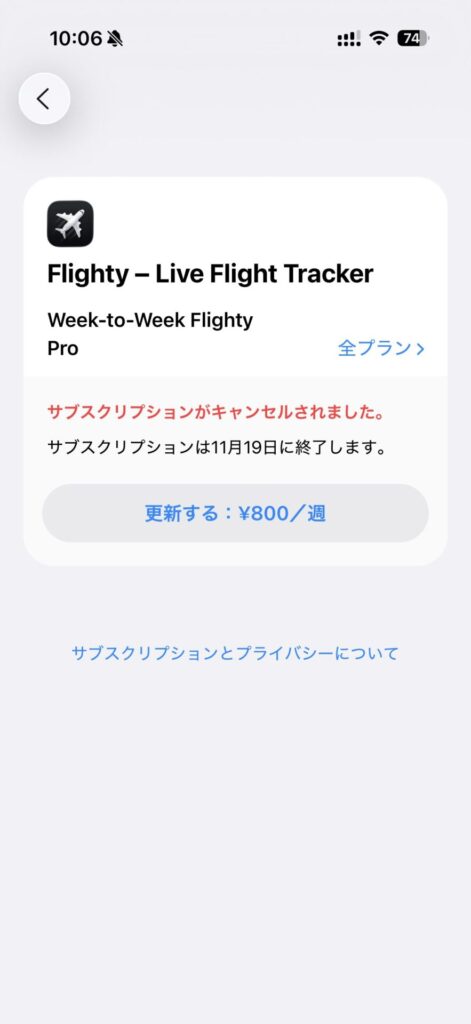 Flighty PROのサブスクキャンセル。iPhoneの設定>サブスクリプションから確認とキャンセルができます。1週間後に自動で更新で課金されてしまうので、忘れずにキャンセルしておきましょう。