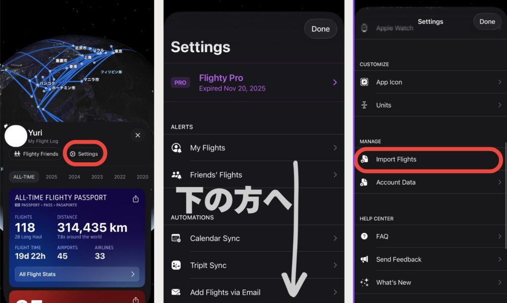 次にFlightyのアプリで、Setting>MANAGE「Import flight」メニューへ。