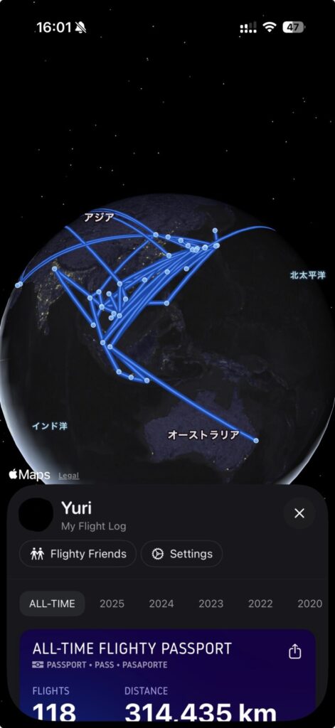 アプリで年ごとと、全期間のフライト内容を見ることができますが、私の人生での飛行機移動がこんなのだったか〜!!と地球に線がたくさんはいった!