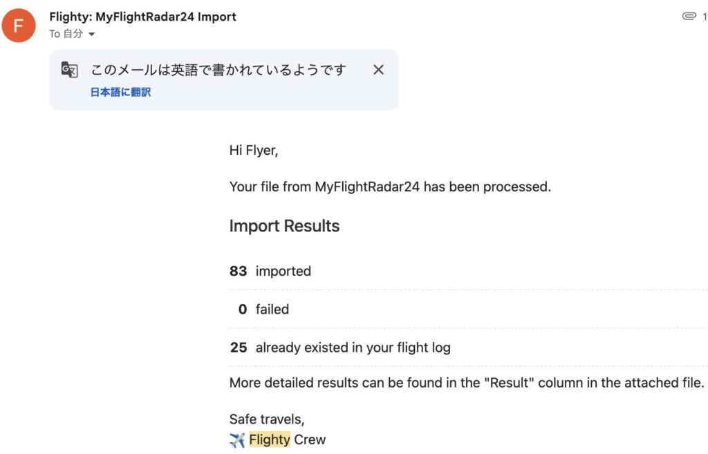 すると、Flightyからメールが届くので、先ほど保存したCSVを添付して返信。まもなくFlightyから下記のようにインポート結果が届いたら完了です!!