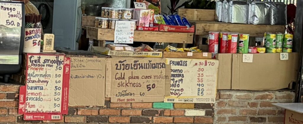 フルーツスムージーが50バーツ(約250円)〜。プリングルスポテチは小さいのが30バーツ(約150円)。車酔い対策用の「Plum soda」50バーツもあり、結構色々揃っている。