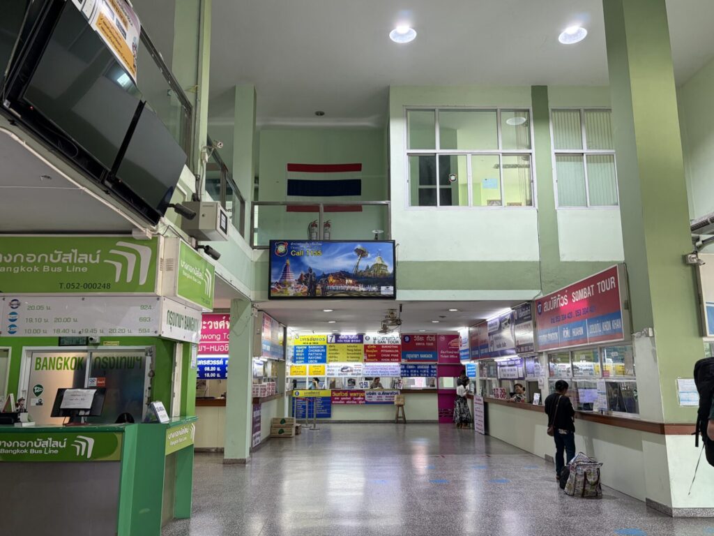各社のバスチケットオフィスが並んでいる。私は待ち時間の間にスコータイ行きのバスをサクッと予約できました