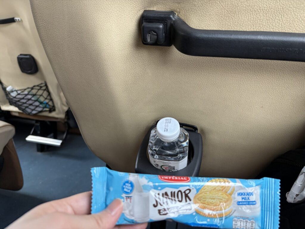 VIPクラスは、小さいペットボトルの水に加えて、クッキーがもらえた。座席はフットレストもあり快適。行きのXClassと比較すると抜群に快適!!500円課金の価値ある〜〜!