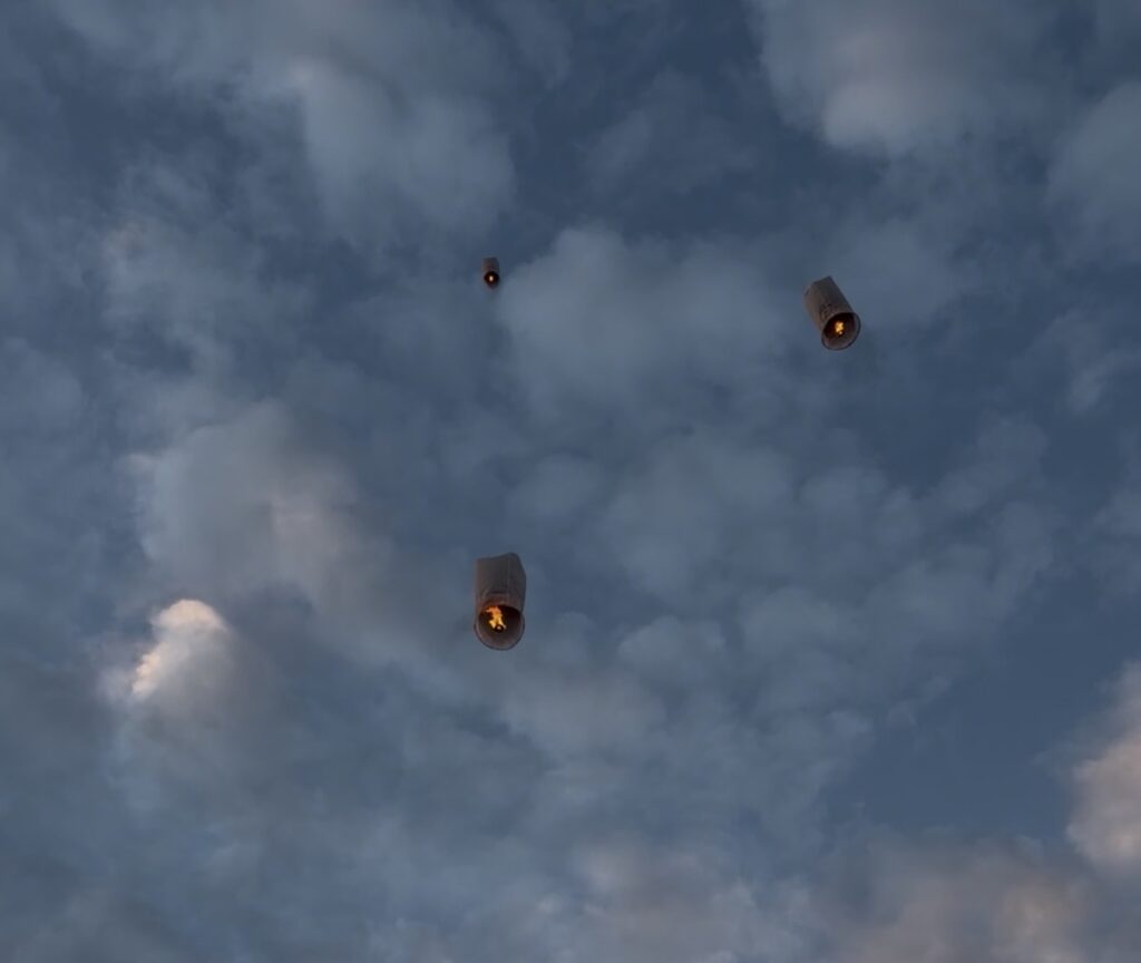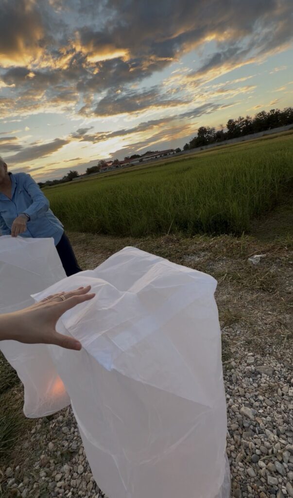 ツアーのプログラムには書いてなかったけど、帰り際、夕暮れ時に近くの田んぼの空き地に寄って、スカイランタン飛ばす体験をさせていただきました!なんたるサプライズ!