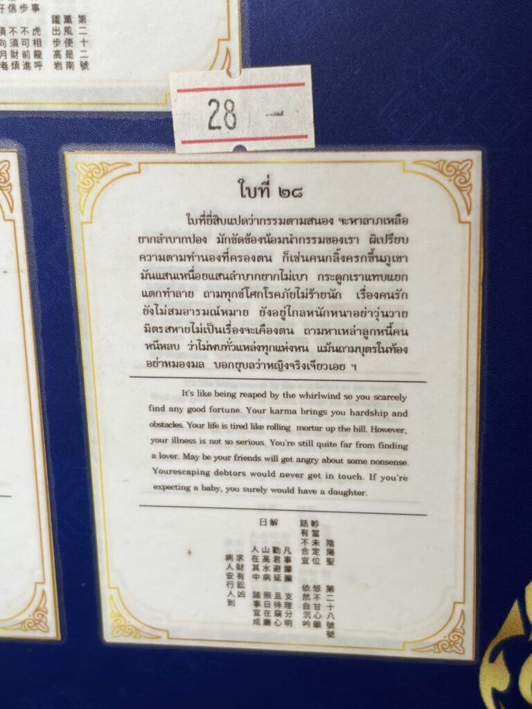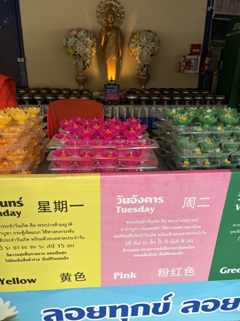 こちらのお寺では、ガイドのサニーさんから、お祈りの方法教わったり、ろうそくに火をつけて水に浮かべたり、おみくじをさせてもらったり、タイのお寺の経験値が上がった。一人できたら絶対に近寄れないエリアだった。