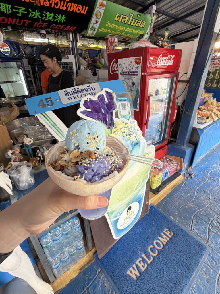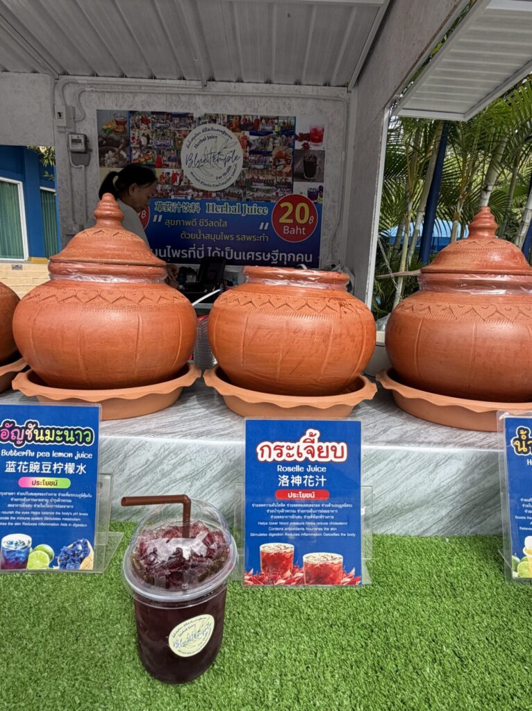 ハーブジュース20バーツ(約100円)と、ブルーココナッツアイス45バーツ(約200円)。ブルーココナッツアイス、ぜひ試して欲しい美味しさ!
