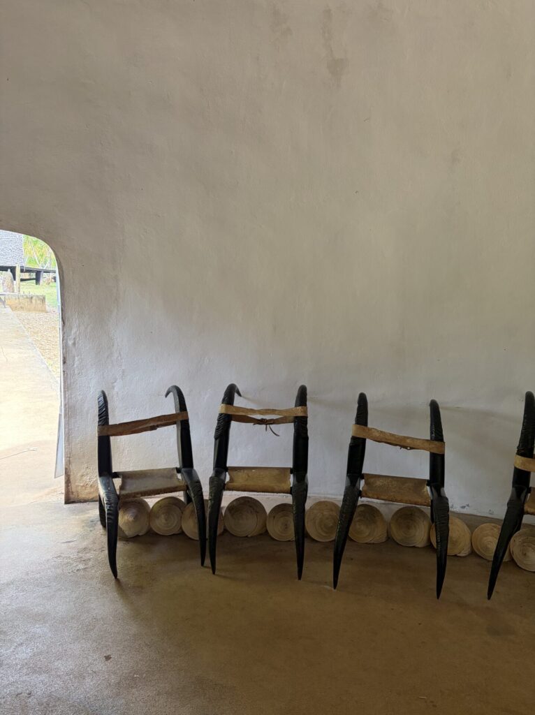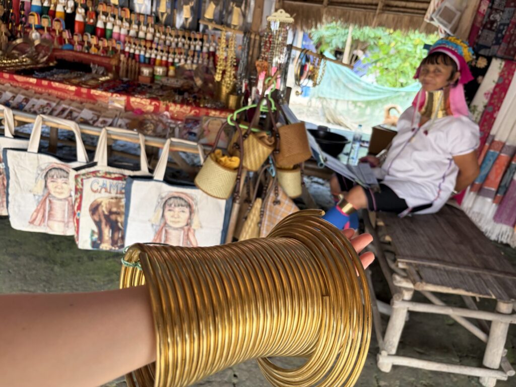 首長族の方が、首に巻いているのはブラス製の首飾り。持ってみるとめちゃ重くてびっくりした。同じ素材で作ったというリングも自分用に購入。写真撮影は、ダミーの首飾りだから軽かったし、後ろがぱかっと開くよ。 - 14:20