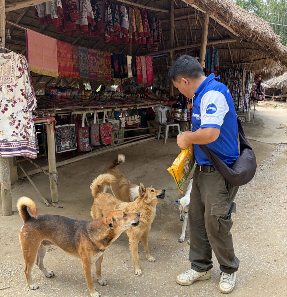 村のわんちゃんにもお菓子をあげるガイドのサニーさん 最初から最後までサニーさんの元を離れない子がいた 犬が多いけど人慣れしているから吠えられたりしない