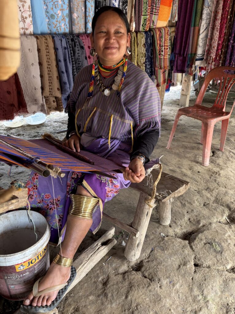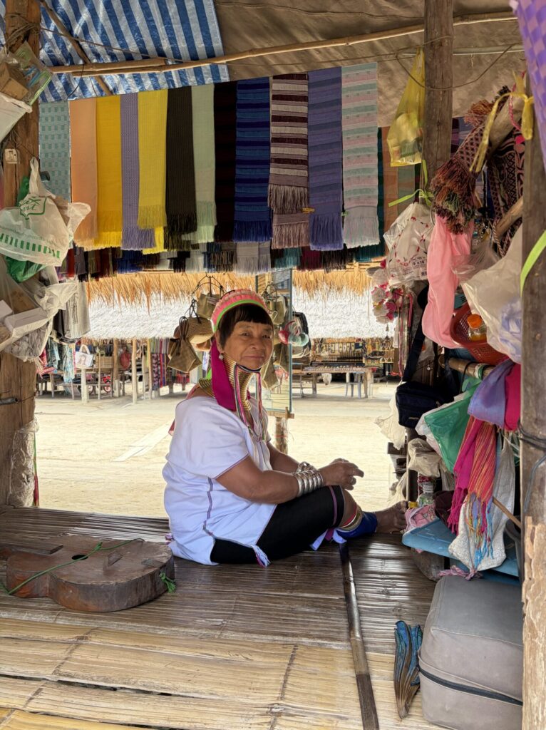 多分首長族の方で一番有名な方 この方をモデルにしたお土産もあるし、テレビか何かで見たことある気がする まっすぐこの方の元へ連れて行ってくれたガイドさん、村を知り尽くしている感凄いわ こちらの有名な首長族の方、お土産の販売をガツガツ押し売りされる風ではなくて、とっても穏やかでした。この方からカレン族のお土産を直で買えたのは嬉しい。(実はこの後行くアヘン美術館で同じマグネットがちょっと安く売られてたけど、購入元がカレン族っていうのは大きい)