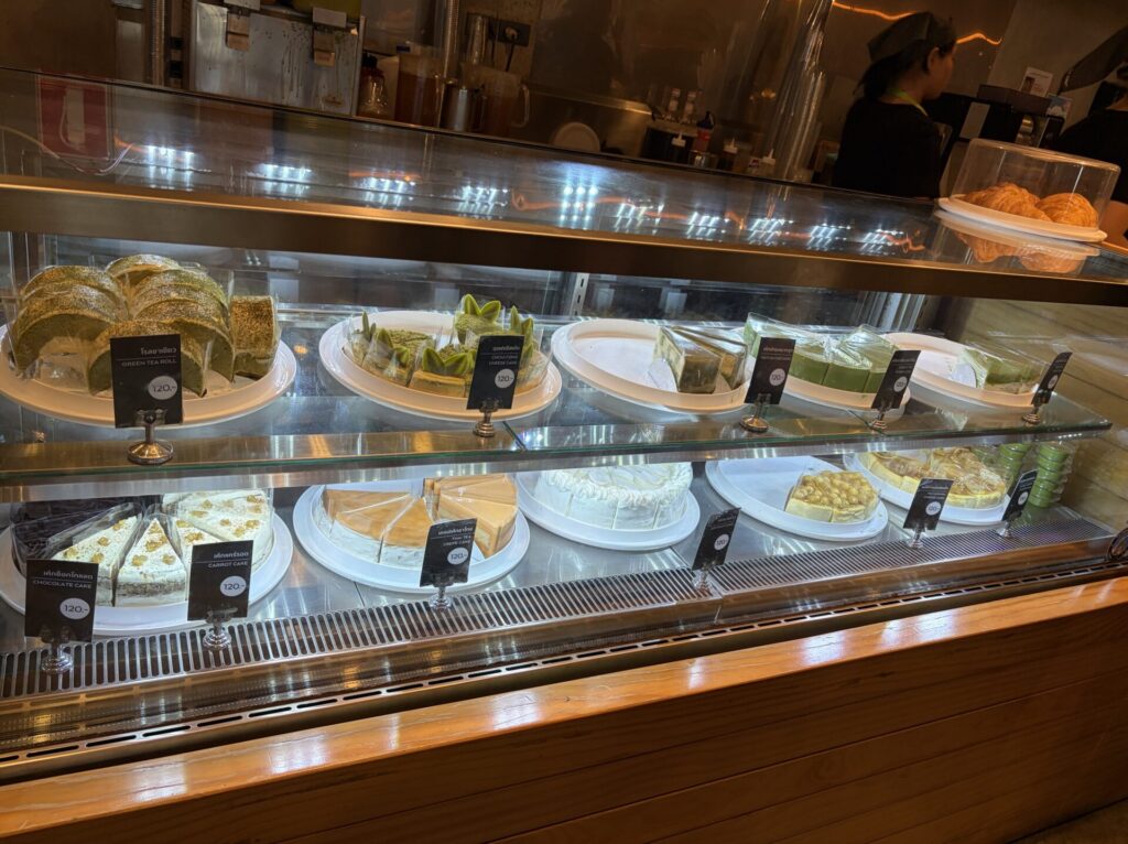 開放感あるカフェで気持ち良い!! 私は、手前のChoi Fong Cheese cake120バーツ、アイス抹茶ラテ70バーツを注文。ツアー参加者3人で、チーズケーキ3種を食べ比べしたけど、私が選んだチーズケーキが一番好評でした😋