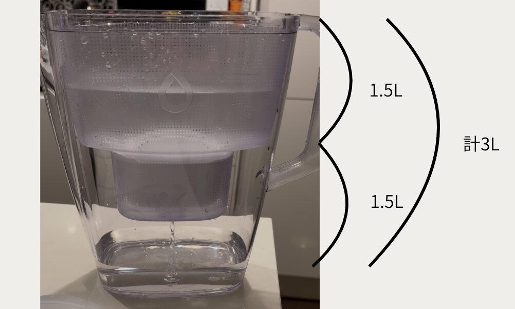 容量は、浄水前と後の水が1.5Lずつで、計3L入る。