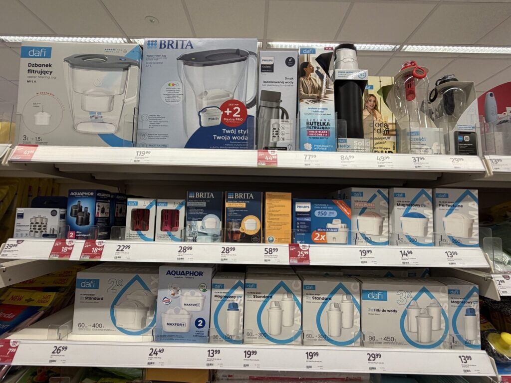 ポーランドのお店にもしっかり、マイボトル型浄水器並んでました。冷蔵庫スペースを取りたくない人、旅行が多い人にオススメ!