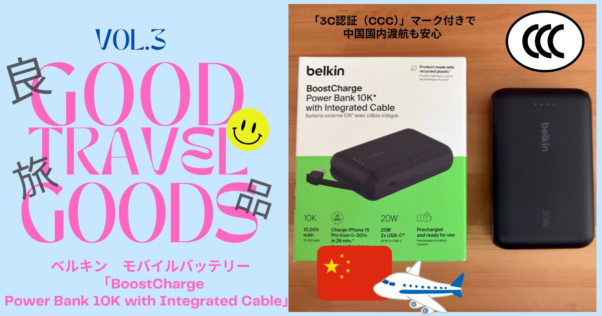 前回の旅行で、中国国内便乗り継ぎを利用する予定があったため、慌てて買い換えた、ベルキンの「BoostChargePower Bank 10K with Integrated Cable」。