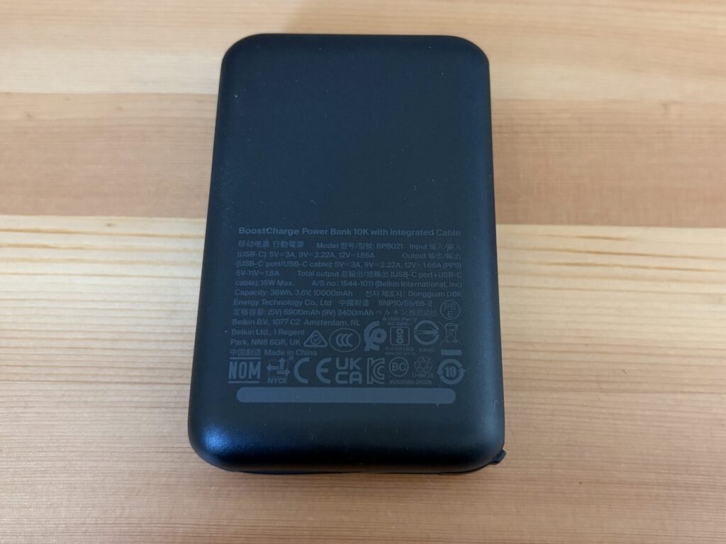 BelkinのUSB-Cケーブル一体型モバイルバッテリーには、背面にしっかり中国「3C 認証マーク」が印字されているので、安心して持っていくことができます。