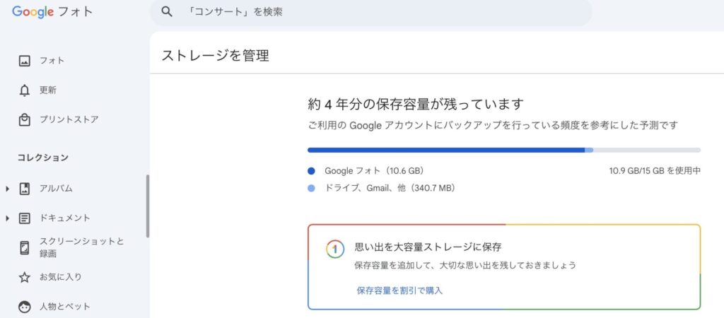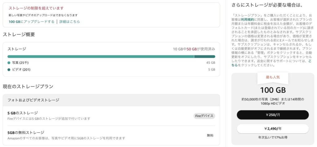→プライム会員であれば無制限に写真は保管可能。しかし、 最近プライム会員を解約したため、半年後には容量超過分が削除される予定。動画はプライム会員でも制限ありで満杯状態。