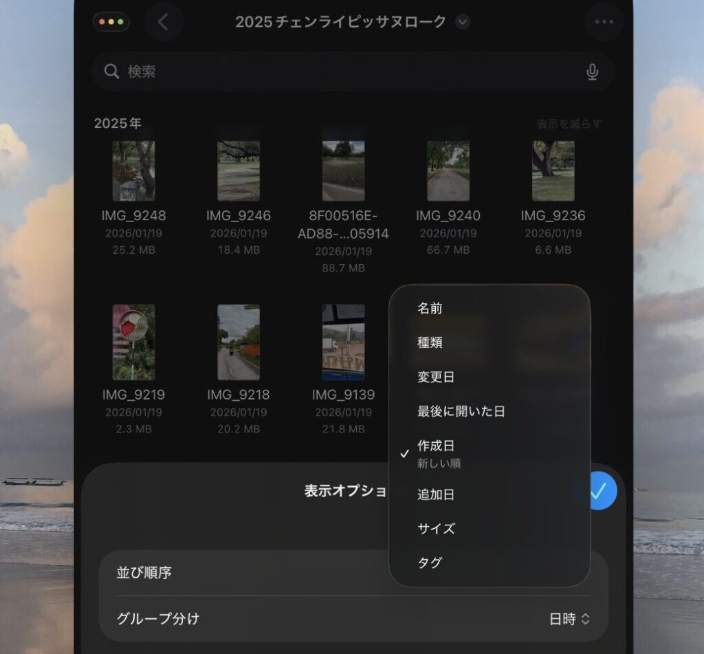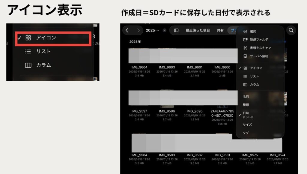 表示方法をいろいろ試してみましたが、「ファイルアプリ」の一覧表示画面上で、アイコン表示(写真を最大で表示する)にすると、実際に撮影した日付を表示をする方法が見つかりませんでした。