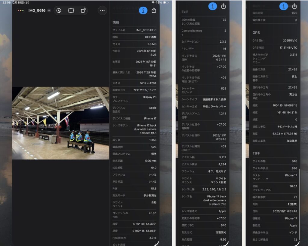 1枚なんとなく撮影した写真に、これだけの情報がついて保存されているのスゴイ!