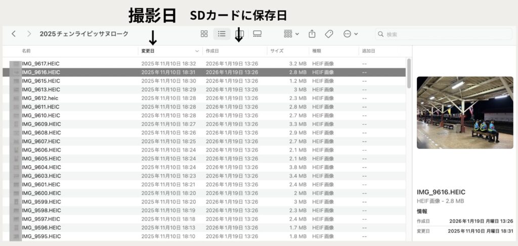 リスト表示にすると、撮影日(=変更日)と、作成日(=SDカードに保存した日)を並べて表示させることが可能。