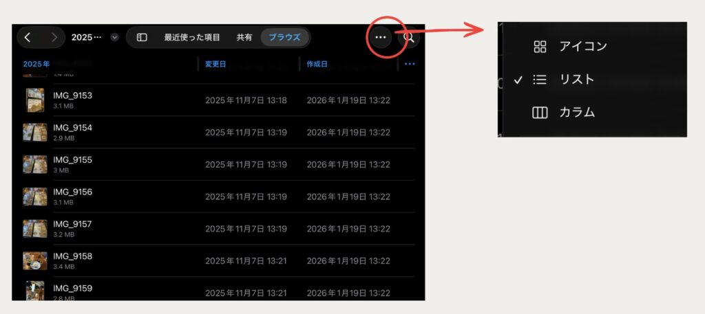 「ファイルアプリ」で表示方法を切り替えるには、右上の「・・・」をタップします。