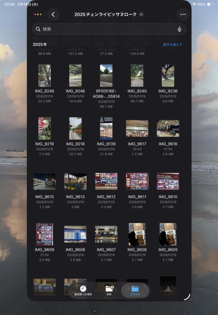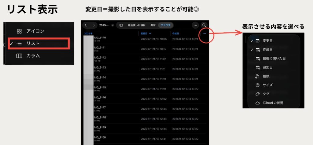 - リスト表示: ファイル名、サイズ、更新日などがリスト化されます。ファイル名で探す場合や、詳細なファイル情報を確認したい場合に便利。画像は小さめ表示。→撮影日から探すなら、この表示が一番見やすい!!