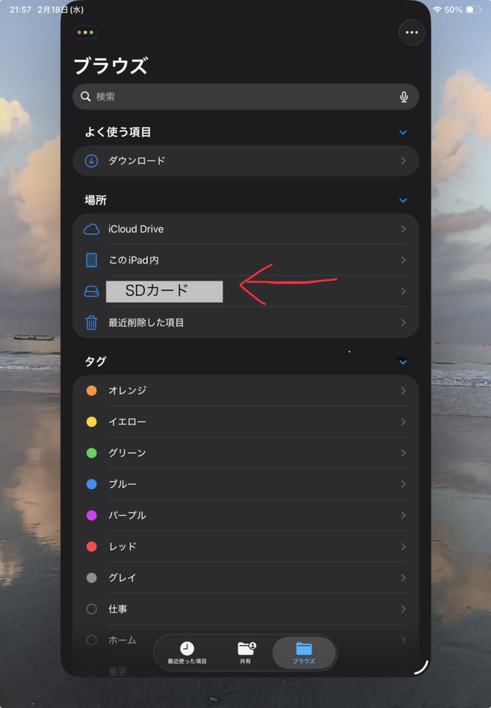 SDカードをiPhone ・iPadに挿入したら、Apple純正アプリの「ファイル」を開きます。