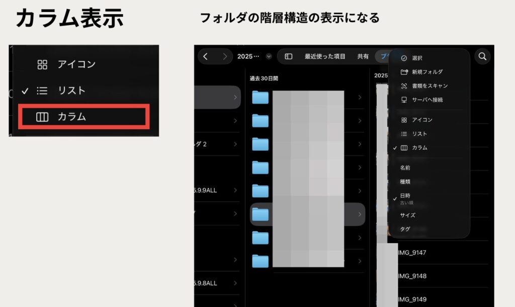 すると、「アイコン」「リスト」「カラム」から表示の方法が選べます。