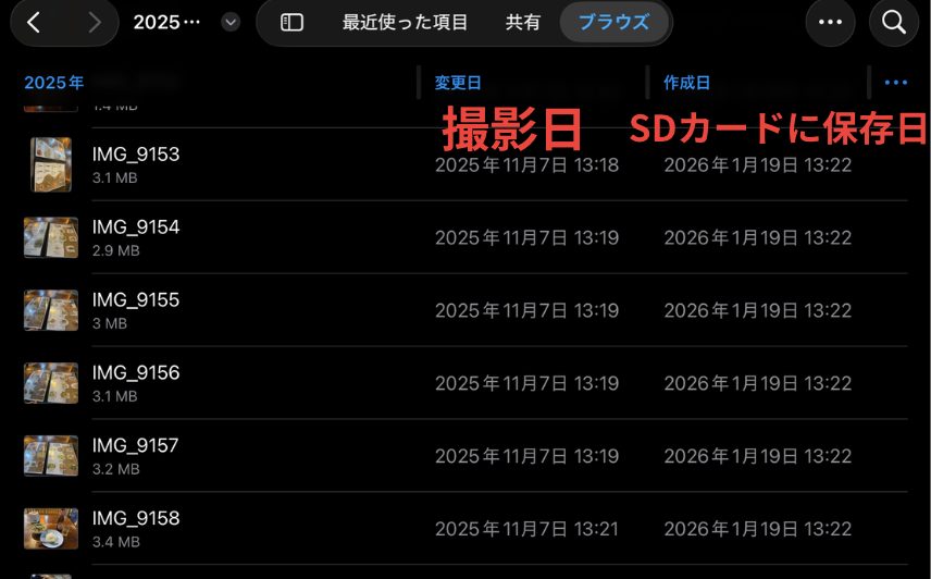 スクショの写真に表記されている日付(2026/1/19)、実はこれ撮影日ではなく、SDカードに保存をした日付が出ています。