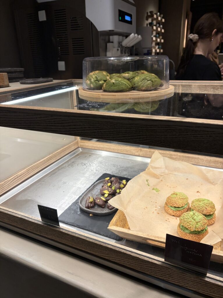 入り口入ってすぐのショーケース内のスイーツ美味しそうだな〜〜抹茶シュークリームやチョコレート、クッキーなど。