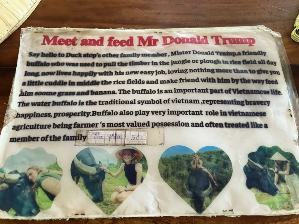 水牛とのふれあいは、オプションで₫50,000(約¥300)。水牛に乗れる体験は珍しいので、せっかく現地に足を運んだなら、オプション追加することをオススメします。